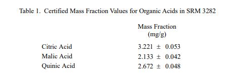測定有機酸的分析方法:SRM 3282 中有機酸質量分數的賦值是基于 NIST 使用液相色譜法和吸光度檢測(LC-吸光度)和離子色譜法和電導檢測(IC-CD)提供的結果的組合)。