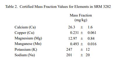 有機酸和元素的認證質量分數值分別在表 1 和表 2 中提供。 NIST 認證值是 NIST 對其準確性具有最高置信度的值,因為所有已知或可疑的偏差來源都已被調查或考慮在內 [1]。價值分配分析由 NIST 和合作實驗室進行。認證值計算為 NIST 方法的平均值和合作實驗室提供的平均結果的中位數(如果適用)。相關的不確定性以大約 95% 的置信水平表示 [2-4]。