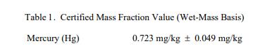 表 1 中提供了汞的認證值,表示為基于濕質量(原樣)的質量分數 [1]。該值基于使用冷蒸氣同位素稀釋的主要方法進行的分析電感耦合等離子體質譜 (CV-ID-ICP-MS) [2,3]。 NIST 認證值是 NIST 對其準確性具有最高置信度的值,因為所有已知或可疑的偏差來源都已被調查或考慮 [4]。認證值的不確定度以擴展不確定度的形式給出,以大約 95% 的置信度覆蓋被測量。擴展的不確定性計算為 U = kuc 其中uc 是與 ISO/JCGM 指南 [5] 一致的組合不確定度,k 是對應于大約 95% 置信度的覆蓋因子 (k = 2)。被測量是表 1 中列出的汞的總質量分數。計量可溯源至 SI 派生的質量分數單位(以毫克每千克表示)