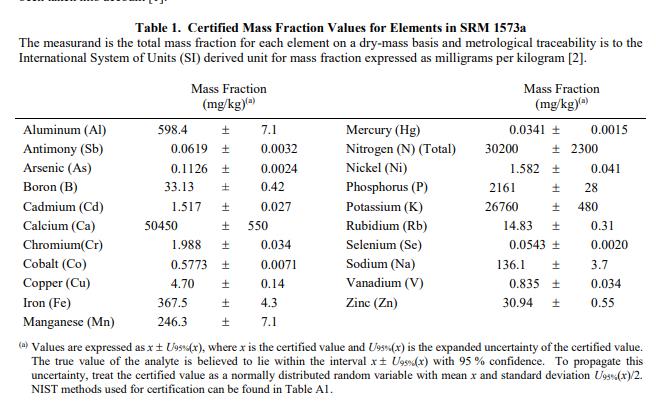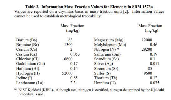 SRM 1573a 番茄葉(標準品)主要用于驗證測定植物材料、農產品和類似材料中主要、次要和微量元素的分析方法。在為內部控制材料分配值時,此 SRM 可用于質量保證。一個 SRM 1573a 單元由 50 克干番茄葉組成。認證的質量分數值:認證的質量分數值在表 1 中提供。 NIST 認證值是 NIST 對其準確性有最高置信度的值,因為所有已知或可疑的偏差來源都已被考慮在內