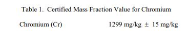 表 1 中提供了基于干質量報告的鉻 (Cr) 認證質量分數值。NIST 認證值是 NIST 對其準確性有最高置信度的值已知或可疑的偏倚來源已被調查或考慮 [1]。 Cr 的認證值計算為方差加權平均值,基于使用 NIST [2] 標準添加方法校準的電感耦合等離子體質譜 (ICP-MS) 獲得的平均值,并提供單個結果的加權平均值由附錄 A 中列出的合作實驗室提供。