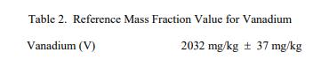 表 2 提供了釩 (V) 的參考質量分數值,以干質量為基礎報告。NIST 參考值是一個未經認證的值,它是基于可用的真實值的最佳估計數據;但是,這些值不符合 NIST 認證標準,并提供不確定性,所有已知或可疑的偏差來源尚未得到充分調查[1]。 V 的參考值基于使用標準添加方法校準的單一 NIST 方法 (ICP-MS) 獲得的平均值。